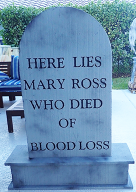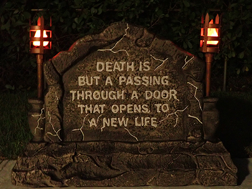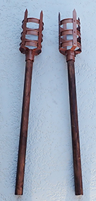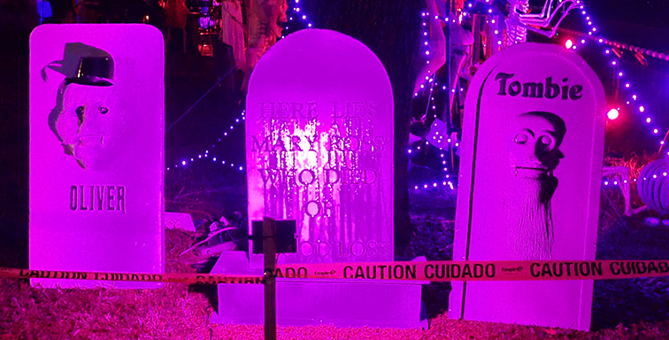 Modified a tombstone purchased from Home Depot. Painted letters & cracks with grey latex outdoor paint. Made torches using fake flames purchased from Amazon.